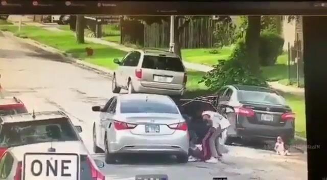 Here's a wild video where some guys pull up in a car and start shooting at some other people standing around minding their own business. There's no audio to this video, so we don't know if anything was said. There's also no context to the beginning of it or any idea on who or why someone was recording at the moment it happened. However, it looks like a mom gets shot in the leg and tries to run away, then jumps on the baby's body to protect the child as she takes cover behind a car.