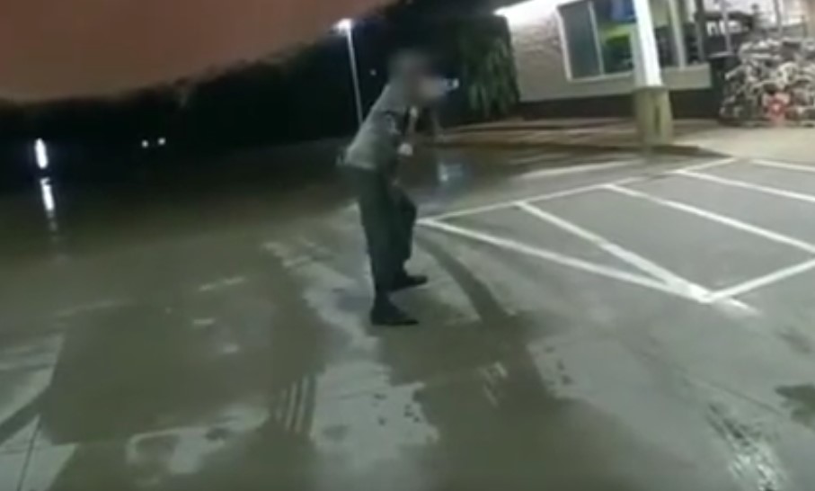 Here's a perfect example of the saying "f-ck around and find out." This suspect had some sort of weapon in his hand and seemed to be toying with the cop, making movements that suggest he could turn aggressive at anytime. It did seem like for a minute he was sorta kidding with the cop, but the cop has to take every situation pretty seriously if the suspect has any sort of weapon at hand.